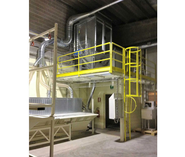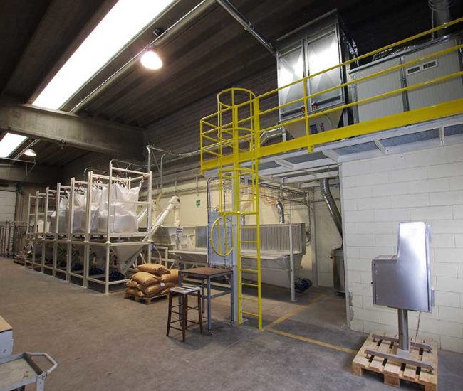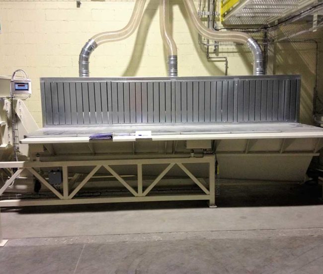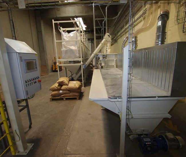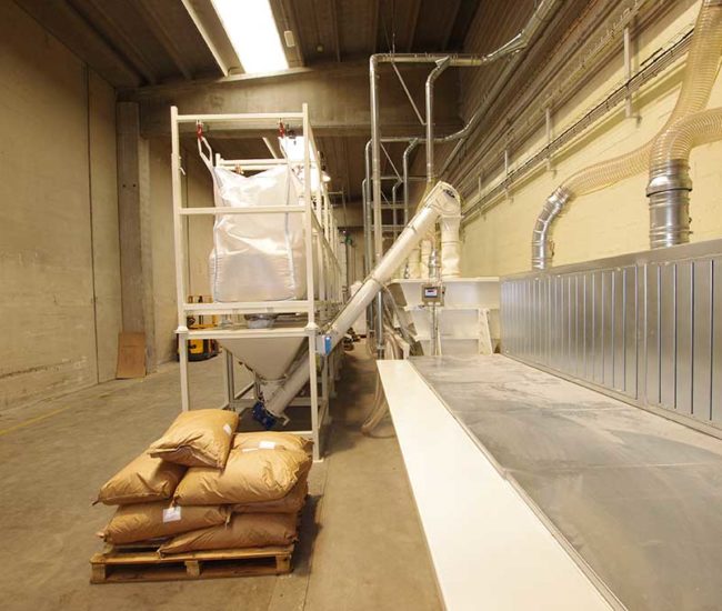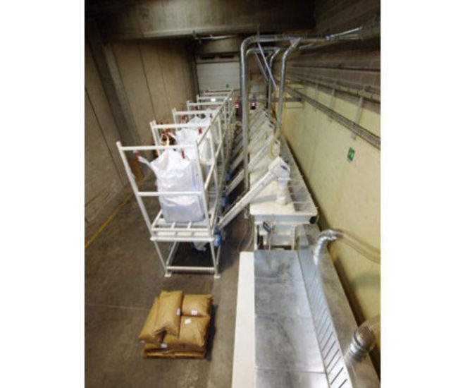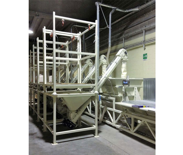The system has two hoppers to load animal feed. Hoppers are fitted with weighing cells which, by interfacing with specific software, dose the material from big bag receiving units. The entire system is fitted with suction to purify dust from product handling.