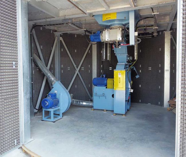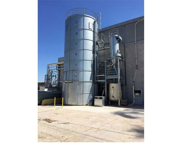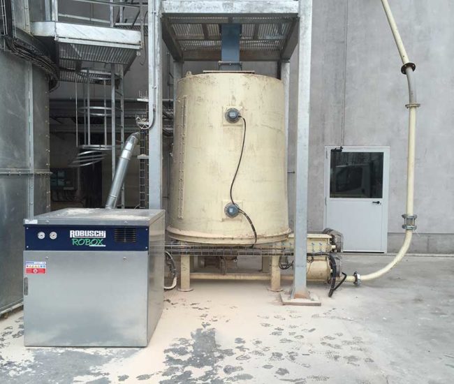 The system is fitted with storage silos with air flow filter system and dust extracting and refining filter, pneumatically loaded (after being filtered for a second time) inside a dispenser which feeds the thermal plant.