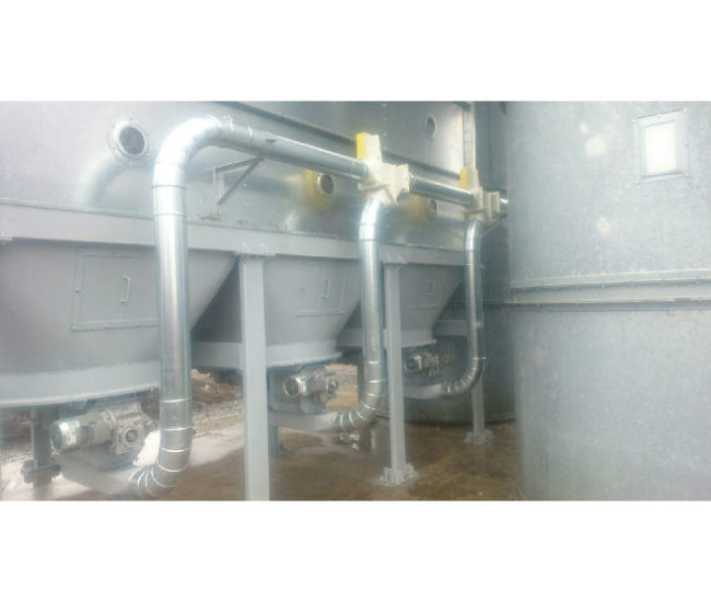 These storage facilities are pneumatically loaded by high pressure aspirators and fitted with extractor and rotary valve, to enable product dosage and loading to the following process.