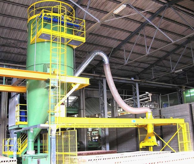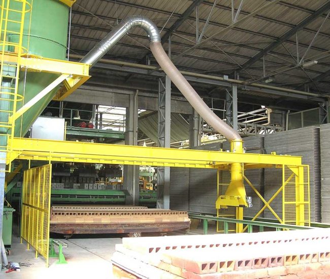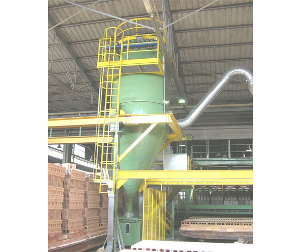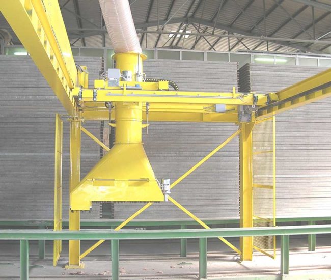In the field of construction material production, MCM s.r.l. offers its own air suction and purification systems. As is the case with this roller cleaning machine which convey bricks, fully automated and fitted with a cyclone filter which cleans captured dust.