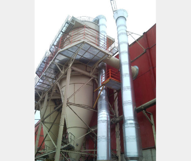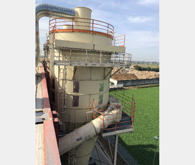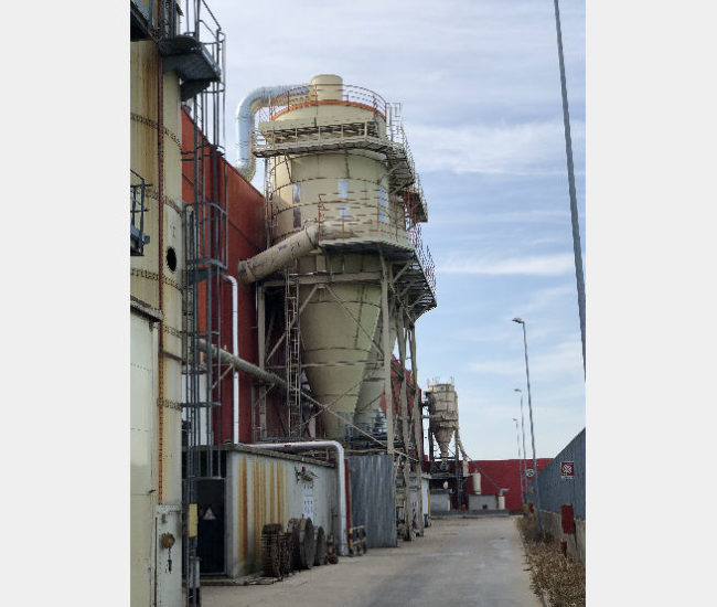Ciclonfiltro progettato per grandi portate d’aria con elevate quantità di materiale in sospensione. Il materiale, grazie alla decantazione, cade verso il basso e viene dosato e scaricato da una valvola stellare, fino ai successivi processi di lavorazione. L’aria pregna di polveri viene filtrata attraverso manichelle e quindi emessa in atmosfera dopo essere passata per un aspiratore centrifugo.