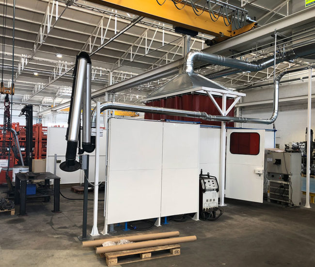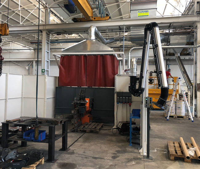 I fumi di saldatura provenienti dalle isole robotizzate, vengono aspirati tramite cappe ambientali e convogliati all’interno di un gruppo filtrante.