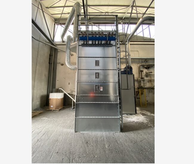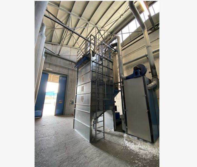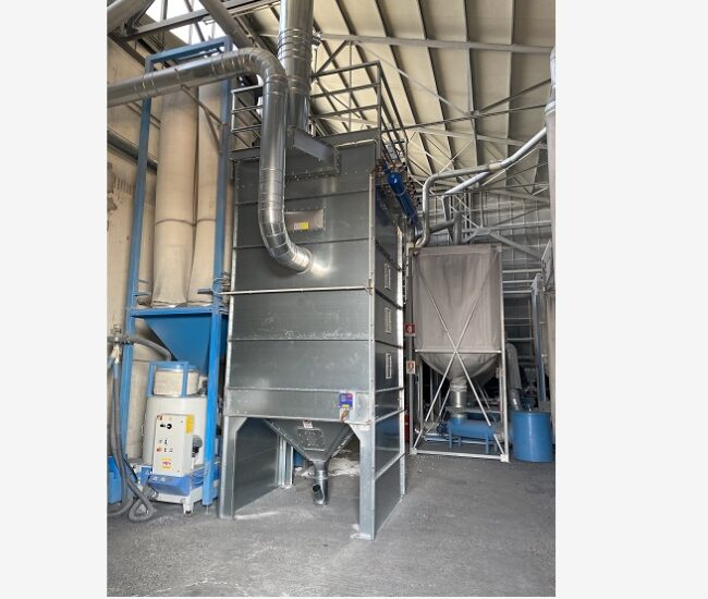 Silos in lamiera zincata pressopiegata utili per lo stoccaggio di polistirolo. La portata d’aria viene filtrata attraverso un gruppo filtrante a cartucce.